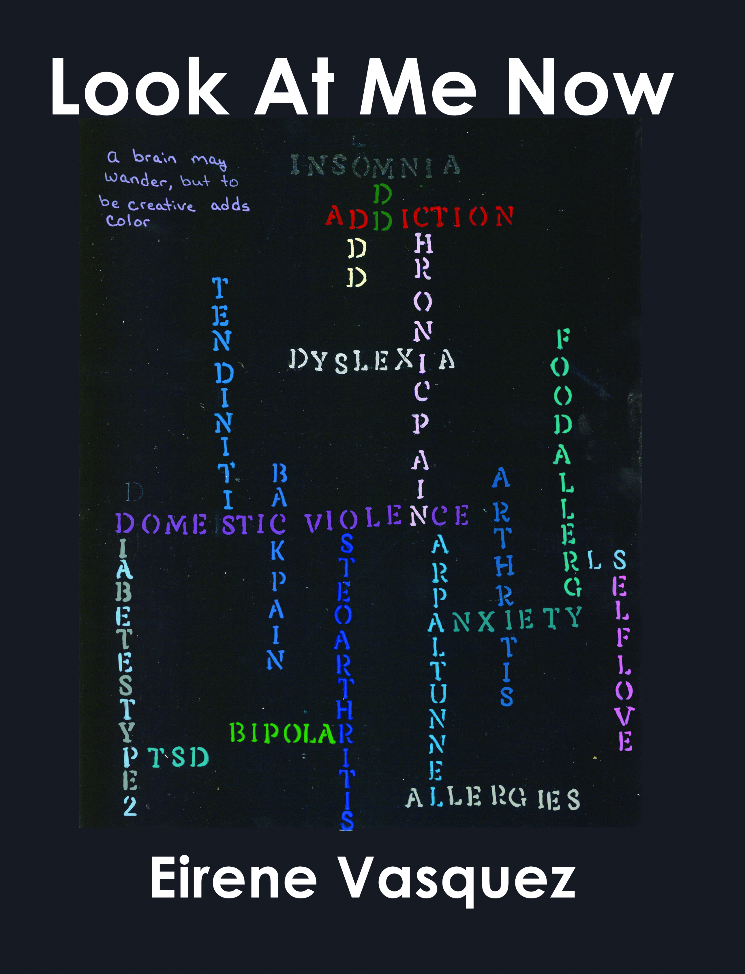 Look At Me Now chronicles the intense fight author Eirene Vasquez had against her anxiety, PTSD, and Major Depression. Vasquez found sanity and healing through her art. Instead of pushing away her family or friends, she would paint. Instead of getting stuck in a cycle of negativity, she would draw. The resulting art came together in Look At Me Now. Each color of the jigs and jags show Anything, Everything, and Nothing—her heart battling through her anxieties, and the hope she feels through her art.