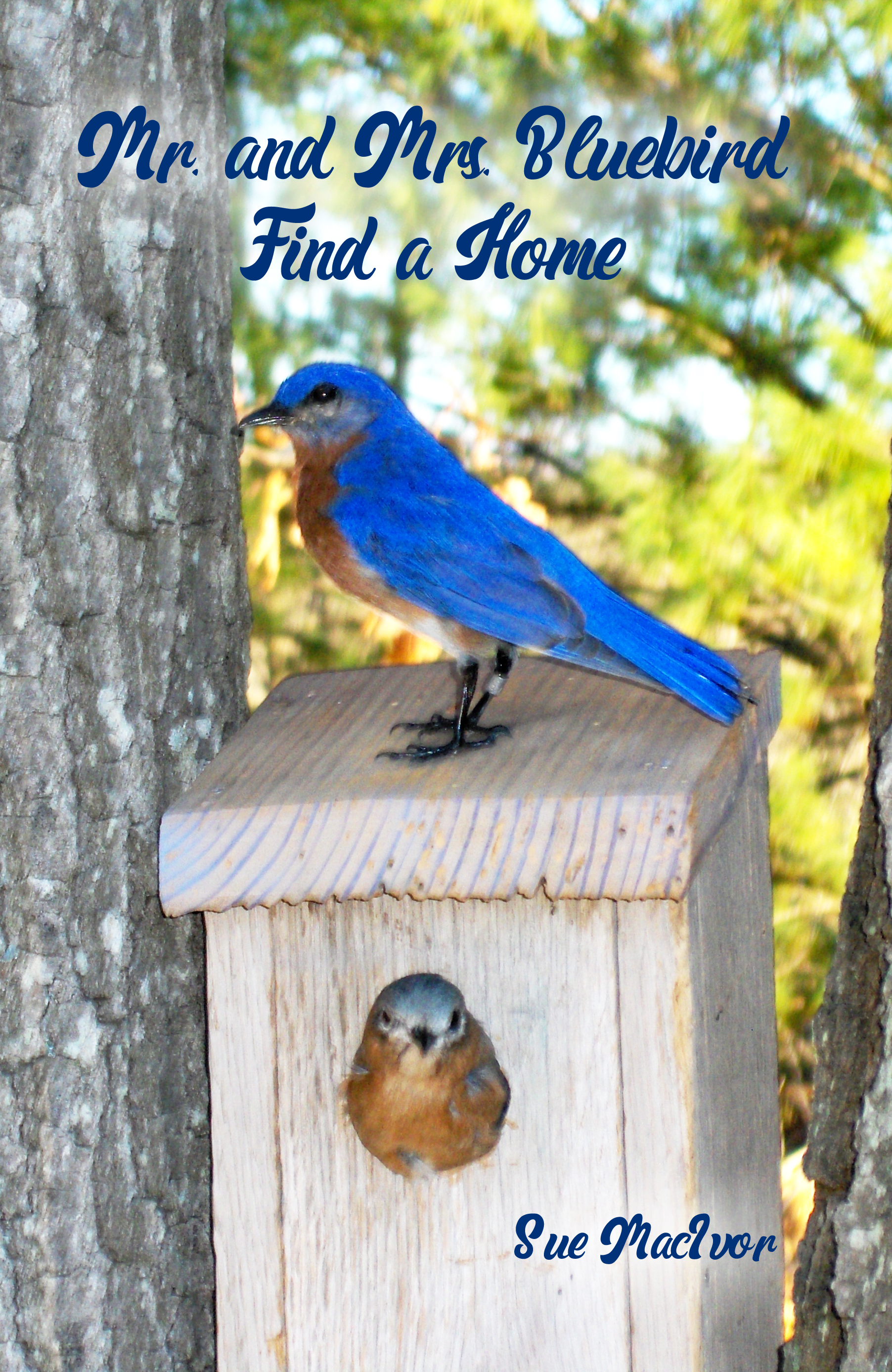 This delightful tale was inspired by a true story. MacIvor and her husband were sitting outside on their deck when a male bluebird found the birdhouse in their backyard. He did call for the female bluebird; she came to his call. The sparrows did attack the bluebirds. The bluebirds won and did build their nest in the birdhouse.